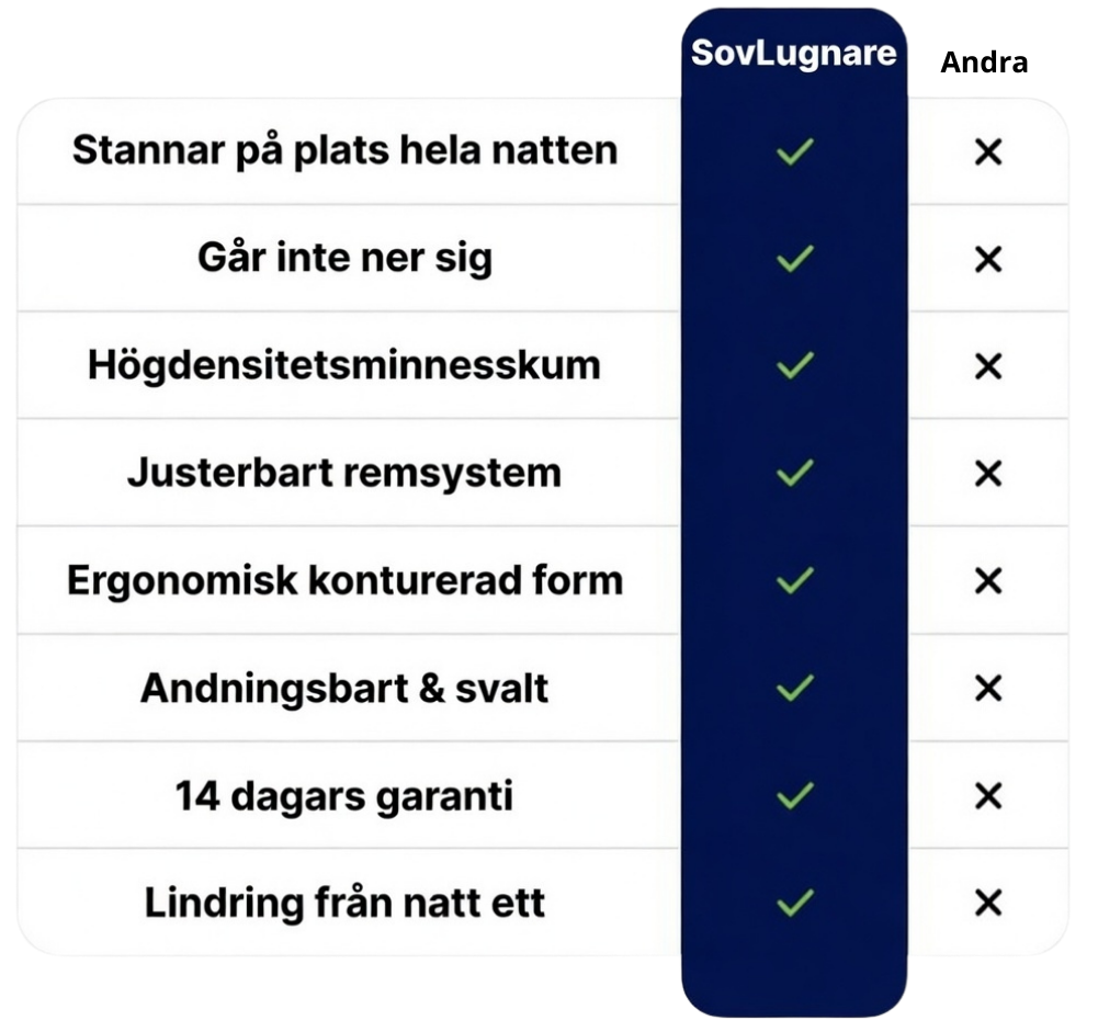 De flesta knĂ€kuddar glider ut vid 02:00 eller plattar under din vikt. SovLugnare har en justerbar rem som hĂ„ller den lĂ„st pĂ„ plats och högdensitetsskum som hĂ„ller formen hela natten â inte bara de första 20 minuterna.